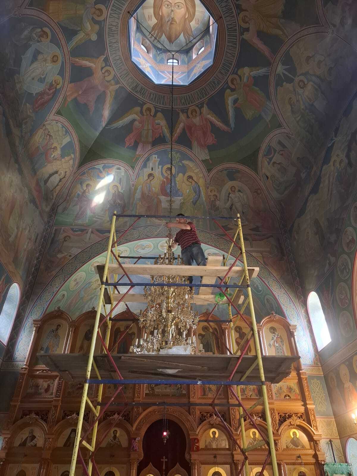 Сергей практически в одиночку, с помощью Божией, снял старое паникадило и повесил новое. Учитывая размер и вес, настоящее чудо!